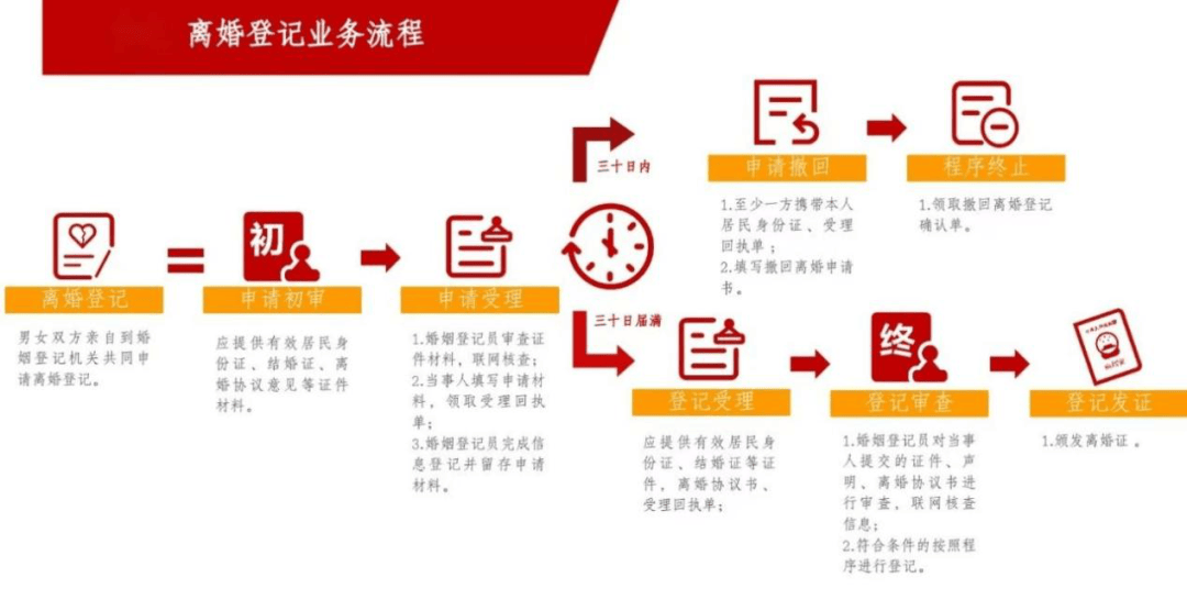 •自婚姻登记机关发放《离婚登记申请受理回执单》之日起30日内(自婚姻登记机关收到离婚登记申请之日的次日开始计算期间,期间的最后一日是法定休假日的,以法定休假日结束的次日为期间的最后一日),任何一方不愿意离婚的,可向受理离婚登记申请的婚姻登记机关撤回离婚登记申请。30日后(如遇节假日顺延),双方亲自到婚姻登记机关申请发给离婚证;婚姻登记机关查明双方确实是自愿离婚,并已经对子女抚养、财产以及债务处理等事项协商一致的,予以登记,发给离婚证。30日后60日内(如遇节假日顺延)双方当事人未共同到场申请发给离婚证的,视为撤回离婚登记申请。