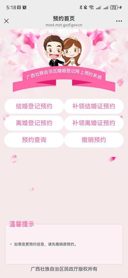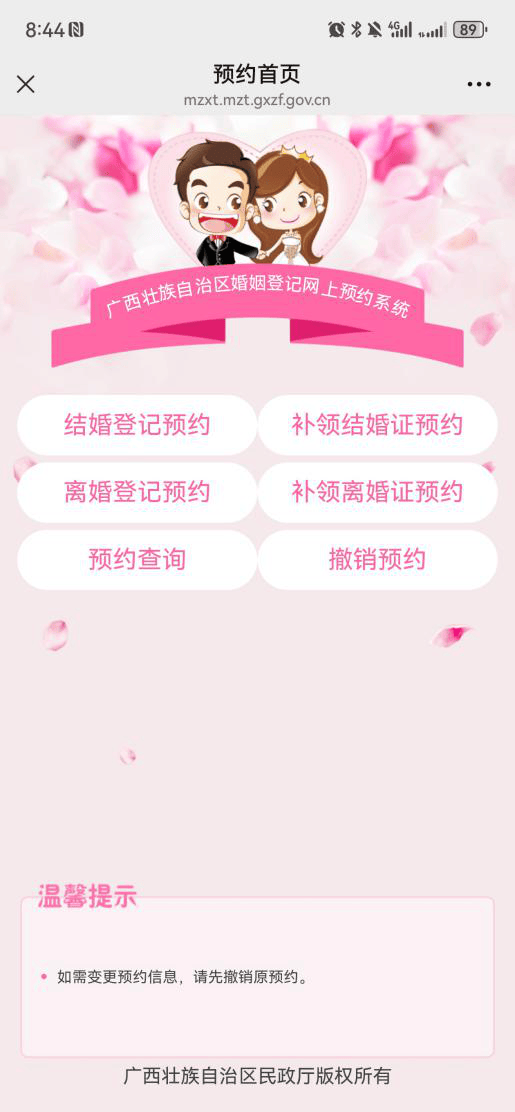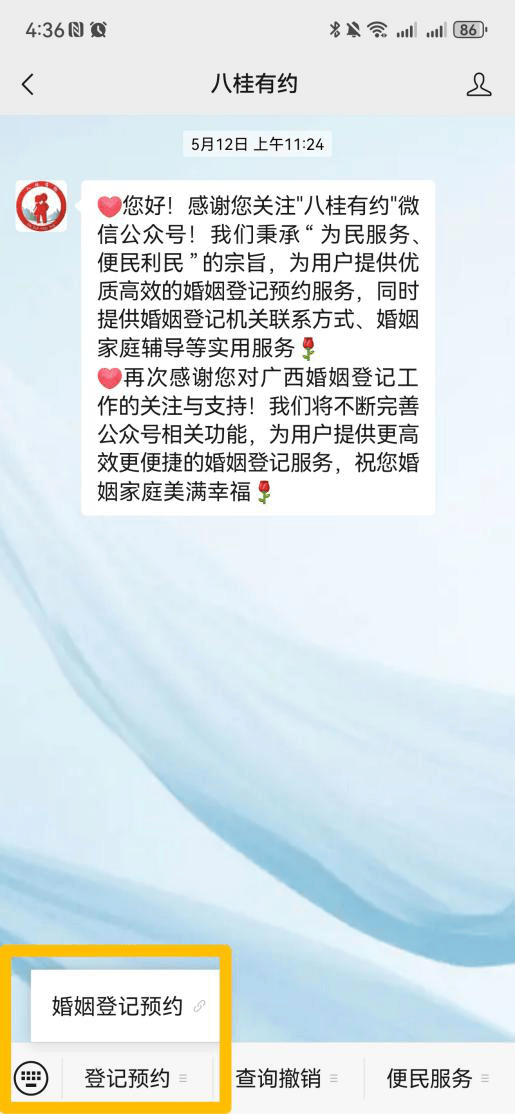 方式二:手机微信搜索“梧州民政”公众号,进入后首页点击“便民服务”,选择“婚登预约”即可进行预约。